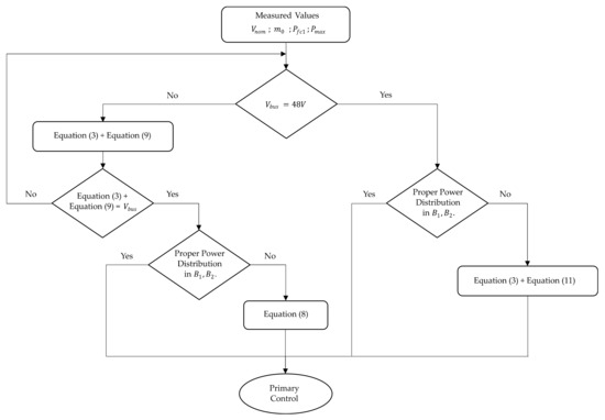 Figure 10 shows the flowchart on the Distributed Secondary Controller for an Efficient Battery, which is based on voltage restoration and power sharing. In secondary control development, it is necessary to implement and design the primary control (conventional droop control) to modify the reference voltage. In the first instance, the values of the primary control are evaluated and incorporated in the distributed control in order to have a communication link between the storage units. When evaluating the voltage on the DC bus, it should remain in the 48 V regime, which allows the analysis of the appropriate power sharing; otherwise, if this factor is not complied with, a control action based on a consensus algorithm is added to compensate for this power deviation. If the voltage does not remain in the 48 V regime, a control action is incorporated to allow voltage regulation; when this parameter is satisfied, it is checked if the power is distributed correctly according to its capacities. Since it does not have a correct power distribution, a control action , which is the joint value of the regulatory action , and a consensus algorithm is incorporated.