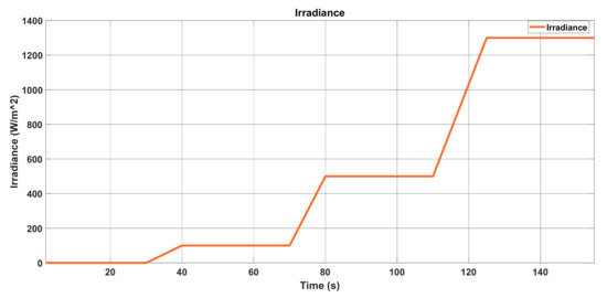 For the validation of the efficient management of the storage units, a distributed control scheme based on a consensus algorithm is proposed. An isolated MG-DC was considered, consisting of storage units and a generation unit which were designed and modeled using MATLAB/Simulink by simulation; the system consisted of a PV and two batteries of different capacities connected in parallel to a DC bus, which supplied the demand to a load. It is worth mentioning that the storage units’ full charge and discharge response would take several hours; however, to verify the charge and discharge cycles, the operating range of the SOC was restricted. Therefore, the simulated results were run for 155 s, with a smooth transition from a cloudy to clear sky, meaning the loading and unloading of the ESS could be appreciated for further analysis based on the SOC. The controllers were subjected to different radiation scenarios to verify the correct and efficient operation of charging and discharging the batteries. The analysis was performed using batteries with different capacities that allowed us to visualize the appropriate charge distribution according to the different capacities without overcharging the battery with a lower capacity. The system parameters for both the batteries and the PV are shown in Table 1 and Table 2, respectively. The parameters of the converters, A, B1, B2, filters, and load are given in Table 3.