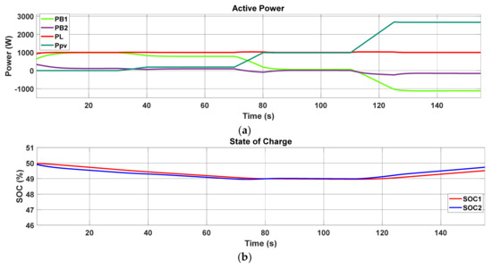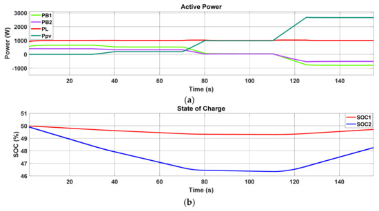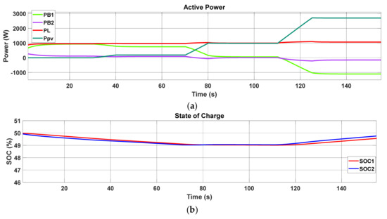 The power bad distribution limitations at the DC load supply were corrected by incorporating the power compensation component in the distributed secondary control based on a consensus algorithm. This method ensured that the batteries distributed their power according to the parameters that characterized each battery. Figure 3 shows that the converters connected in parallel were controlled by a conventional droop function together with a secondary control; then, a distributed control action was designed based on a consensus algorithm , which was implemented in the droop function at the primary control level. Figure 16a shows the appropriate power distribution for each storage unit, verifying that the unit with a higher capacity delivered a higher power (green line) and the unit with a lower capacity provided a lower power (purple line). The SOC of the ESS presented a minimum deviation between the two batteries in their discharged state; this means that the two batteries experienced a similar discharge condition regardless of their capacities, which made the batteries degrade equally (Figure 16b). While in the charging mode, the lower-capacity battery presented a sharing adequate to its capacities, i.e., its charge was faster (Figure 16b). An efficient MG-DC’s performance in preserving battery life was validated.