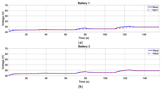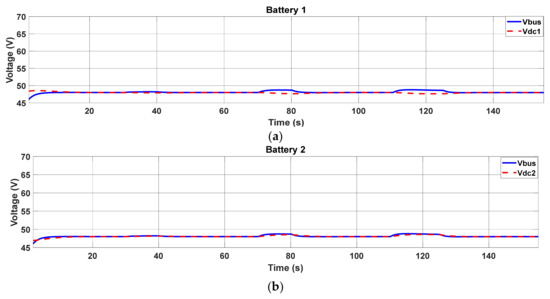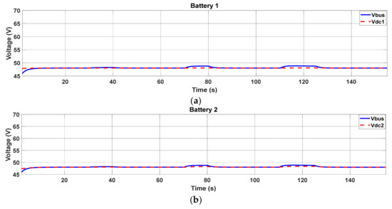DC bus voltage control with conventional droop for (a) battery 1 and (b) battery 2 at a time of 155 s.