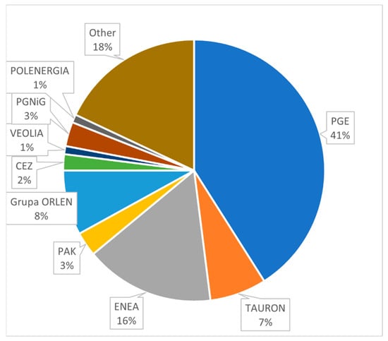 For several years, PGE Polska Grupa Energetyczna S.A. has had the largest share in the generation of electricity, with a share of about 41%. The second major player is ENEA with a 16 percent share. TAURON is in third place with 7%. Detailed data on the energy producers is presented in Figure 2.