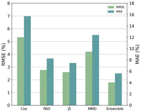 Moreover, compared to using a single metric to predict the accuracy drop, the ensemble method provided better performance. The ensemble method achieved an RMSE as low as 1.79% and a MaxAE of 5.62%. This was because the ensemble method took advantage of different metrics that could capture complementary distribution information to further improve prediction performance [21]. Overall, the ensemble method decreased the RMSE to below 1.80%, indicating that the predicted accuracy drop with the ensemble metrics was close to the ground truth. This also implied that it was feasible to predict the models’ performance drop by distribution divergence.