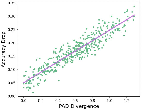 The low RMSE and MaxAE of the selected metrics can be explained by the strong relationship between the divergence and accuracy drop. For example, the relationship of the accuracy drop and PAD divergence is presented in Figure 5. A strong relationship between the PAD divergence and accuracy drop can be observed: the Pearson correlation coefficient is 0.87. According to [43], indicates a strong correlation between two variables.