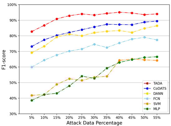 Considering this work used imbalanced datasets, the F1-score of the TADA framework and other compared models under different attack data percentages are shown in Figure 6. The results show that the detection performance of all methods was generally increasing as the percentage of attack data increased and datasets became more balanced. When the attack data percentage was less than 25%, the TADA framework demonstrated a significant improvement compared to the other models. The F1-score of the TADA framework did not further improve when the attack data percentage was higher than 25%, but it still outperformed the other models. Overall, the TADA framework showed the highest F1-score when the attack data percentage varied, which indicated that the TADA framework could achieve robust detection performance against variations in attack data percentage.