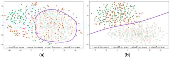 Distribution of normal and attack data in the feature fusion layer when (a) domain-adversarial training was not applied and (b) domain-adversarial training was applied. The circles represent normal data, while the dots represent the attack data. The green dots and circles correspond to data from the source domain, and the orange dots and circles correspond to the data from the target domain. The decision boundary is plotted in purple.