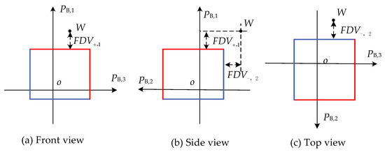 In this paper, we use FD measures to represent distances of OV, abbreviated as FDV. Explanations of the FDVs with three lines in a 3-dimensional coordinate system are shown in Figure 1 and the three-view drawing in Figure 2. The vertical distances from the operating point to the nearest upper or lower boundaries for all lines are the FDVs. Because the operating point is out of the upper limit of line 1 and the lower limit of line 2, there are FDVs against the upper limit of line 1 and lower limit of line 2. As there are no violations of either the upper and lower limits of line 3 or the lower limit of line 1 and the upper limit of line 2, the corresponding FDVs are zeros. For each line, there are forward and reverse FDVs, respectively. Thus, the total quantity of FDVs is twice the number of feeders. FDVs are non-negative numbers. The FDVs is zero if no OVs occur in the line; on the contrary, the FDVs are positive if OVs appear in that line.