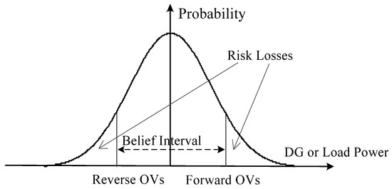 In order to deal with uncertainty issues, multi-time-scale optimization methods are used widely, which employ ahead schedule combined with deviation correction in shorter time scales, thereby reducing the effect of uncertainty by employing more definite short-time-scale scheduling combined with long-time-scale optimization to overcome the adverse impact of the uncertainties. For example, a scheduling scheme of an integrated energy system with a multi-time scale was constructed in [5] considering V2G and the dynamic characteristic of gas pipelines, ref. [6] provided a schedule of muti-time scale for microgrids. The day ahead schedule was combined with the intraday schedule to reduce deviation. However, multi-time-scale treatments are incapable of eliminating the risk of uncertainties ultimately. Robust scheduling methods use intervals to describe the uncertainty variation ranges of the quantities and ensure the security constraints in the worst case of the intervals. In reference [7], a two-stage coordinate robust algorithm was established to maximize the profit of the microgrid. Reference [8] proposed a robust optimal for the active distribution network. The minimum confidence interval of Beta distribution for distributed energy was employed to guarantee stable and efficient operation. It is worth mentioning the intervals in robust should be taken as the belief intervals. In addition, the sub-optimal solution that was compromising the economy and security will be chosen within the intervals in order for the quantities to comply with security constraints in the whole intervals. The chance-constrained optimization is another approach to cope with uncertainties. The chance-constrained method solves uncertainties by introducing probability constraints instead of rigid constraints. The ref. [9] used the Monte Carlo to sample finite scenarios and transform the uncertainty problem into a deterministic problem with change constraints for power grids with massive electric vehicles and renewable energy resources. In ref. [10], a double-iterative algorithm was proposed for chance-constrained optimal power flow of integrated transmissions and distributions. With the chance-constrained method, the constraints are relaxed to probability form and are guaranteed in the probability of belief. From the characteristics of the two methods, we can conclude that the robust optimization method compromises the economy to guarantee security, whereas the chance-constrained optimization method relaxes security to pursue the economy. Both methods require to be provided with probability conditions such as belief intervals or belief degrees within which security constraints must obey. Whereas, if the quantities happen to occur outside the designated intervals in robust or lower than the degrees of probabilities in chance constraints are regarded as an occasional occurrence at very small probabilities. The probability of these events is below a given belief level and thus are deemed as risk events. For risk events, whether the security constraints are met or not is regardless of robust and chance-constrained methods. Therefore, the prevailing uncertainty methods concern only believable events. Neither the robust nor the chance-constrained methods are able to deal with risk.
