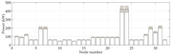 By using the method described in Section 4, a model was constructed to calculate the violation risk in the N-0 security region of the DN with day-ahead scheduling. The power injected into each node follows a normal distribution that is independent of the distribution of other nodes. The probability density function of the power injected into each node is constructed with the maximum range of fluctuation in expectation being . The predicted load values are shown in Figure 6. The red lines show the expected load values, and the fluctuation range is shaded.