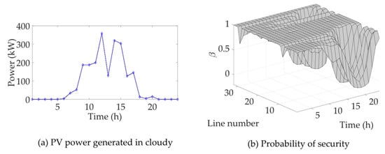 Figure 7a shows a certain probability of an OV event. Therefore, the DN network cannot fully meet the N-0 security and have certain OV risks. In this scenario, the OV risk of the DN can be obtained. The OV risks are shown in Figure 7b. According to Figure 7b, the OV risks particularly show a high level in lines 1–10 and lines 22–24, although almost every line has a high OV probability in some events. This phenomenon is due to the AVS costs of different lines. Due to the high AVS cost of connected nodes and the high probability of OV events, the OV risk in lines 1–10 and lines 22–24 increases significantly. The above analysis is based on the sunny days PV characteristics. If the weather changes to cloudy, the PV power generated would drop significantly, and the power drop in the period will become uncertain. Refer to the PV power generated curve in Figure 5b, plot the PV power curve of cloudy days as shown in Figure 8a, and the probability of security of cloudy days is shown in Figure 8b.