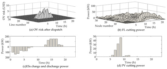 Figure 9a shows the risk of forwarding OV referred to the security region of the DN with the minimum total operating cost. A comparison of the OV risk of the DN before and after optimization shows that before optimization, the peak OV risk value was 167.6 USD in 18 h, and in node 22, the total duration of OV was 13 h. After optimization, the total duration of the forward violation was reduced to 14 h, with a peak value of 7.93 USD in node 13. These results show that the optimization model can significantly reduce the violation risk of the DN. Figure 8b shows the FLs dispatch result. From Figure 7b and Figure 9b, although only in lines 1–10 and lines 22–24 exists a high level of OV risk, FLs curtailment is present on almost all nodes to reduce OV risk due to the compensation characteristics of FLs. Figure 9c,d show the power dispatching results of ESs and PVs in the DN. Since the dispatch results of each ESS and PV have a smaller difference, Figure 9c,d only gives the total dispatch results. It can be seen from the figure that the ESs are charged during the low electricity price period and chooses to discharge during the normal electricity price period when the OV risks are high. The PV also has power curtailment when reverse OV appears. These results are followed by the expectations that the optimization can dispatch DGs to avoid risks and reduce costs.