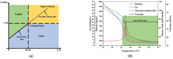 CO2 p–T diagram (a) and variation in thermo–physical properties for SCO2 in 8 MPa (b).
