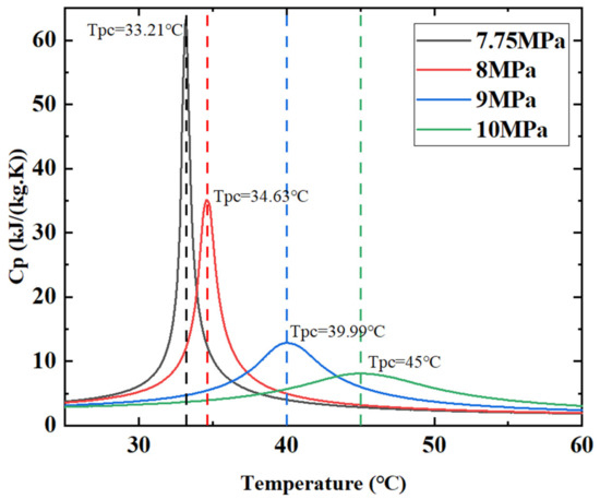 Supercritical fluid is a type of fluid that reaches or exceeds the critical temperature and pressure. Liquids and gases enter the supercritical stage when heated above the critical temperature Tc and compressed above the critical pressure Pc. Above the critical temperature (Tc = 30.98 °C) and critical pressure (Pc = 7.38 MPa), CO2 goes into the supercritical state. Working in this state, CO2 does not undergo a phase transition (Figure 1a). Thermo–physical parameters of SCO2, e.g., the density and dynamic viscosity, change dramatically when approaching the critical point, as shown in Figure 1b. This is the notable feature of SCO2 compared to constant–property fluids. The isobaric–specific heat of SCO2 peaks at the pseudo–critical temperature (Tpc). The rapid and nonlinear changes in the specific heat of SCO2 against the temperature at several supercritical pressures are shown in Figure 2. The pseudo–critical temperature Tpc of SCO2 increases when the working pressure increases. Far from the critical point, however, the change has been less pronounced. When SCO2 is cooling, the initial performance change is small and, when the temperature reaches the Tpc, the performance changes drastically. As the working pressure approaches Pc, the specific heat peak becomes sharper, which makes the heat transfer coefficient increase significantly. Compared with supercritical water, SCO2 is more suitable as a heat transfer fluid because of its lower critical parameters and lower specific volume values. In a typical SCO2 recompression Brayton cycle, as shown in Figure 3a, the cooling process 8–1 makes the density and specific heat of CO2 increase rapidly during cooling near Tc, causing the compressor to deliver a high–density fluid. Therefore, the compression of the high–density fluid by the compressor reduces power consumption and improves the overall thermal performance of the cycle. In the trans–critical CO2 cycle, process 2–3 in Figure 3b is also the cooling process above the Pc, and the heat transfer process at this stage will affect the performance of the whole cycle. Tpc can be written and calculated as an algebraic function of the working pressure. The unit of working pressure is bar and the unit of result temperature is Celsius [22].