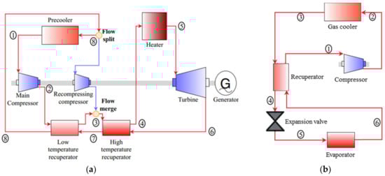 Schematic diagram of a typical SCO2 recompression Brayton cycle (a) and a trans–critical CO2 cycle (b).