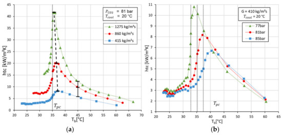 When SCO2 is cooled, the heat transfer coefficient approaches the peak and then decreases. Under the same conditions, except that the flow rate conditions are changed, the flow rate increases and the heat transfer coefficient increases, which is the same as the case of constant characteristic flow, as shown in Figure 6a. Furthermore, when the mass flux is constant, the heat transfer coefficient increases in the cooling process until SCO2 cools to the area with large thermo–physical property changes and the heat transfer coefficient reaches the maximum. The heat transfer coefficient drops suddenly when the fluid enters the liquid state. Under different flow rate conditions, the heat transfer coefficient oscillates near the peak. Liao and Zhao [22], Pitla et al. [23], Yoon et al. [24], Dang and Hihara [25], Kuang et al. [26], Huai et al. [27], Son and Park [28], Jing et al. [31], Oh and Son [32], Eldik et al. [33], Liu et al. [34], Ding and Li [35], Zhang et al. [37], Wahl et al. [39], Dong et al. [53], Huai and Koyama [54], and Lv et al. [55] all experimentally investigated heat transfer characteristics influenced by mass flow with various parameter ranges and drew the consistent conclusions.