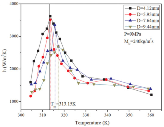 Liao and Zhao [22] conducted experiments on the cooling flow of SCO2 on six horizontal stainless steel tubes with different diameters from 0.5 to 2.16 mm. The Nusselt number (Nu) in the measurement temperature range strongly depended on the pipe diameter, and Nu decreased significantly when the pipe diameter was reduced. The authors attributed the cause to the buoyancy effect. The buoyancy effect became less critical with decreased tube diameter, which was still significant, even if Reynolds number (Re) was up to 105. Dang and Hihara [25] experimentally investigated with different diameters. The authors defined an effective heat transfer coefficient. At bulk temperature (Tb) < Tpc, the effective heat transfer coefficient was not affected by tube diameter. At Tb > Tpc, the effective heat transfer coefficient increased slightly with increasing diameter. Similarly, Oh and Son [32] compared the change in heat transfer coefficient in 4.55 mm and 7.75 mm tubes, Liu et al. [34] compared the change in heat transfer coefficient in 6 mm and 10.7 mm tubes, and Zhang et al. [37] compared the change in heat transfer coefficient in four different pipe diameters between 4.12 mm and 9.44 mm, as shown in Figure 7. All the above studies found that the heat transfer coefficient would increase with the increase in tube diameter, regardless of the range of pipe diameter.