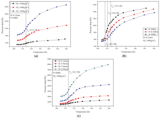 Zhang et al. [37] experimented with different pressure, mass flux, and diameter to investigate pressure drop characteristics under SCO2 cooling conditions. As the temperature of SCO2 gradually increased from Tpc, the pressure drop increased accordingly. The dramatic thermo–physical change near Tpc also led to dramatic changes in pressure drop. Under the same operating pressure, the pressure drop increased with the increase in the mass flux. As the working pressure increased, the pressure drop decreased because the change in characteristics away from the critical region became smaller. Pressure drop increased monotonically with the increase in tube diameter. Furthermore, when the temperature of SCO2 was lower than Tpc, the pressure drop change tended to be flat. The results can be seen in Figure 8. Yoon et al. [24], Dang and Hihara [25], Kuang et al. [26], Huai et al. [27], Son and Park [28], and Liu et al. [34] also conducted experimental studies on the pressure drop characteristics of horizontal tubes with different diameters (from 0.79 mm to 10.7 mm). These scholars all found that the pressure drop increases with the increase in flow rate and decreases with the increase in operating pressure.