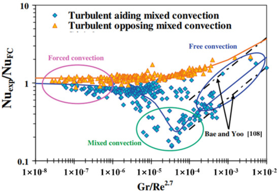 Since the 1950s, scholars have been committed to summarizing supercritical heat transfer empirical correlations to guide practical engineering applications [20]. Likewise, many empirical correlations were summarized under the SCO2 cooling condition, and these correlations are described in detail in Table 3. It is worth noting that these correlations are developed under specific experimental data and the error is basically within ±30%. As shown in Figure 16, the correlations show significant bias due to changes in the study parameter ranges. In addition, the early correlations were developed based on the existing forced convection correlations or conventional fluid correlations and did not consider the thermo–physical properties of SCO2. Recently developed correlations account for changes in the thermo–physical properties of SCO2, making the results more reliable. Some correlations have begun to take into account buoyancy effects. However, up to now, due to the lack of in–depth research on the heat transfer mechanism of SCO2 cooling flow, no co–operative relationship can have good prediction performance in the whole range of SCO2 cooling conditions. It is necessary to conduct further experiments and simulation studies near the regions with the most dramatic changes in thermal properties. The new correlation must consider all the factors that affect the SCO2 cooling heat transfer and be suitable for all application conditions.