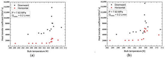 Heat transfer coefficient in different flow directions [38]; (a) mCO2 ≈ 1.323 kg/h, (b) mCO2 ≈ 2.238 kg/h.