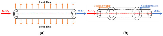 In recent years, with the growing concern about the environment and climate change, new environmentally friendly and low–carbon technologies or technologies that can utilize renewable energy have been widely developed [1]. Carbon dioxide is a safe, nontoxic, nonflammable, economical, and resource–rich natural working medium widely applied in energy systems. It can be used as a refrigerant for refrigeration systems [2], air conditioners [3], heat pumps [4], and other devices in a trans–critical state [5], as well as an adequate working fluid for systems such as thermal power plants [6], advanced nuclear reactors [7], waste heat recovery [8], and solar thermal power generation [9]. In these systems and cycles, the condensers or coolers undergo a supercritical heat transfer process, which plays an essential role in cycle efficiency. Therefore, the study of supercritical cooling heat transfer process is very important for the design of a supercritical heat exchanger [10].