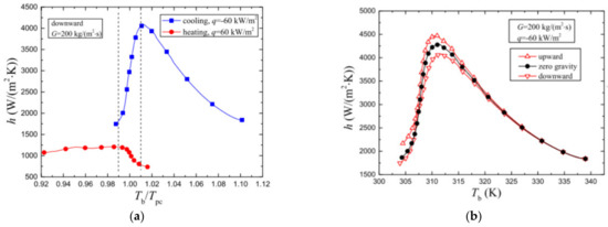 Guo et al. [83] used SST k–ω turbulent model with variable turbulent Prandtl number model (TWL model) to investigate the SCO2 flow and heat transfer in vertical tubes under cooling and heating conditions. The heat transfer coefficient under cooling condition was more significant than that in the heating condition due to more liquid–like fluid near the wall, as shown in Figure 14a. As for cooling conditions, the buoyancy effect enhanced the local heat transfer of the upward flow and deteriorated the local heat transfer of the downward flow, as shown in Figure 14b. Zhang et al. [95] used low Reynolds turbulence model–YS model to investigate heat transfer performance in different flow directions and tube diameters. The results showed that the local heat transfer coefficient reached the maximum when the fluid temperature was near the pseudo–critical point. The heat transfer coefficient was extremely influenced by the tube diameter and flow direction. Jiang et al. [30], Dong et al. [96], Cao et al. [97], and Zhao and Jiang [98] studied the conjugate heat transfer of SCO2 and water with different tube diameters. The heat transfer coefficient increased with the increase in the mass flow rate of cooling water and significantly with the increase in the mass flow rate of SCO2.
