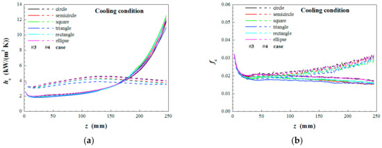 In recent years, microchannel heat exchangers with different cross–sectional geometries have been developed, so it is necessary to study the effect of cross–sectional geometry. Chai and Tassou [81] numerically investigated the impact of six different cross–sectional geometries on the flow and heat transfer characteristics of SCO2 in microchannels. Existing heat transfer empirical correlations were compared under the same heating and cooling conditions. Different section geometries under the same boundary conditions led to different heat transfer coefficients and friction factors, as shown in Figure 15. The cross–sections that obtain larger heat transfer coefficients generally have a more significant pressure drop. Zhang et al. [86] conducted a numerical study of SCO2 with circular, semi–circular, and square cross–sections. A larger heat transfer coefficient, minor fluid friction, and entropy generation can be obtained using a smaller heat flow ratio and working pressure. The peak heat transfer coefficient around Tpc was mainly due to the effective thermal conductivity within the turbulent viscous sublayer.