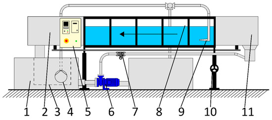 HM 162 experimental flume: 1—water tank, 2—water outlet element, 3—sediment screen basket, 4—sediment pump, 5—PLC (switch box), 6—centrifugal pump, 7—flow rate sensor, 8—open-channel test section, 9—particle (sediment) inlet, 10—inclination adjustment element, 11—water inlet element.