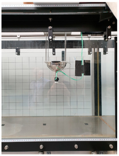 The volumetric flow rate was set to 27 m3 h−1, and the water level was set to 350 mm. The tilt of the channel was horizontal (no tilt). As shown in Figure 4, the particle inlet was positioned in the middle of the width of the test section and 5450 mm downstream of the beginning of the test section. The bottom of the funnel where particles enter the water was positioned 80 mm below the free surface.
