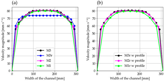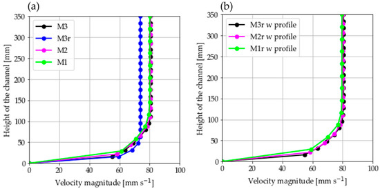 Vertical velocity profiles of water: (a) comparison between three mesh densities for the full domain and the fine mesh of the reduced domain; (b) comparison between three mesh densities of the reduced domain with a velocity profile boundary condition.