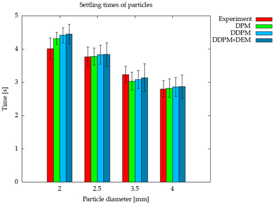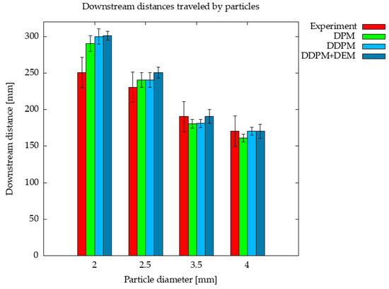 A comparison of calculated settling times obtained using three approaches and experimental values is presented in Figure 7. Satisfactory agreement was achieved for all three simulation approaches, except for the smallest particles with a diameter of 2 mm. A similar observation can be derived from the comparison of the downstream distance travelled by particles before settling on the bottom of the channel, as presented in Figure 8. Interaction between particles does not appear to be significant, as the DDPM approaches with and without inclusion of DEM produce similar results.