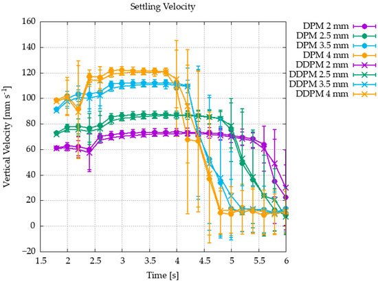 From both the experiment and simulations, it is evident that larger plastic particles settle more quickly than smaller particles, as expected, with the larger particles reaching a higher settling velocity. As shown in Figure 9, all particles reach terminal velocity (flattening of all curves for time evolution of velocity). Similarly, all particles reach the maximum horizontal velocity of the flow; as expected, smaller particles reach this velocity quicker than larger particles. Because larger particles reach the bottom of the channel sooner than smaller particles, their horizontal velocity also drops sooner. As shown by the velocity profile presented in Figure 5, the velocity adheres to a no-slip law (boundary condition); therefore, when particles approach the bottom of the channel, their velocity reduces accordingly. Figure 10 shows that settled particles retain some horizontal velocity in the simulation; however, this behavior is not observed in the experiment because an accurate particle–wall interaction was outside the scope of this study, and only the settling motion in the fluid was analyzed.