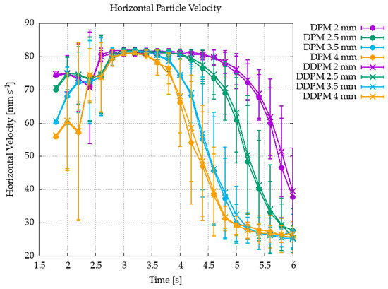 Horizontal velocity of plastic particles; points represent average values, and error bars represent one standard deviation.