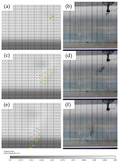 Comparison of the particle cloud as observed in the experiment and the simulation using the DPM approach: (a) and (b) 0.5 s after the release of particles; (c) and (d) 1.5 s after the release of particles; (e) and (f) 2.5 s after the release of particles. Particles are colored by size as described in Table 1. Yellow color is used instead of white in the visualization of the simulation results.