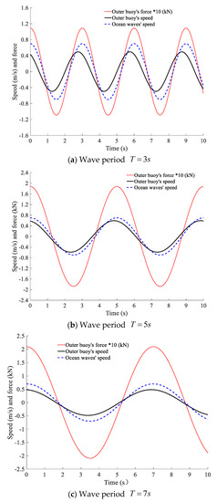 According to Equation (8), Table 1, and certain regular ocean waves with different period , Figure 4 shows the outer buoy’s vertical direction ocean wave force and vertical direction speed, and Table 2 lists the theoretical conversion efficiency from the ocean wave power into the outer buoy and inner buoy’s mechanical power. In Table 2, the wave power is calculated as the product of wave surface power and the buoy’s horizontal cross-section , and the wave surface power can be expressed as
