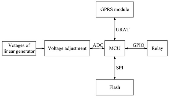 Furthermore, a diagram of the measuring device is shown in Figure 6. As shown in Figure 6, the output voltage of the linear generator (from the double-buoy OWECS) is transformed into 0–5 V by voltage regulation and sampled by the MCU (microcontroller unit). Then, the sampled data can be stored in flash memory or transmitted to the server via a GPRS module. In addition, the function of the relay is overvoltage protection.