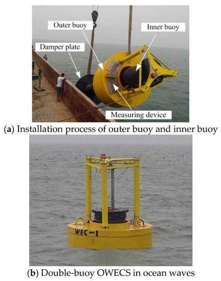 Figure 7a shows the installation process of the double-buoy OWECS in the Yellow Sea near Lianyungang port, and Figure 7b shows its operation in ocean waves.