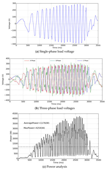 Figure 8a,b show the output load voltages of the double-buoy OWECS collected by the measuring device. Figure 8c is a power analysis of Figure 8a,b, in which the average power is 1.176 kW, and the maximum power is 4.254 kW.