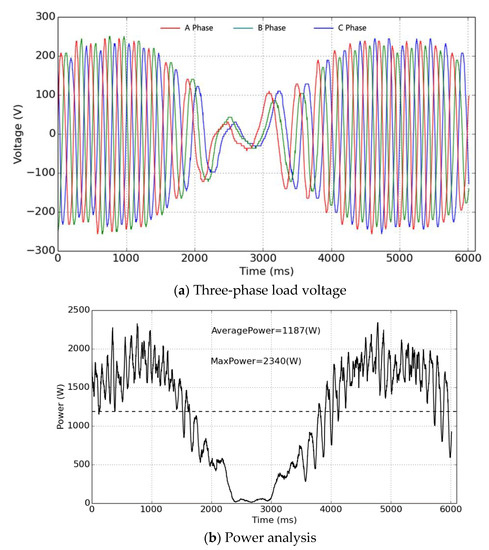 In addition, if the ocean wave period is longer than 5.5 s, in the case of 8.5 s, the output load voltage of the double-buoy OWECS is as shown in Figure 9a,b, along with the average power (1.187 kW) and maximum power (2.34 kW). Furthermore, according to Equation (9), the experiment conversion efficiency from ocean wave power into electric power is 3.4%.