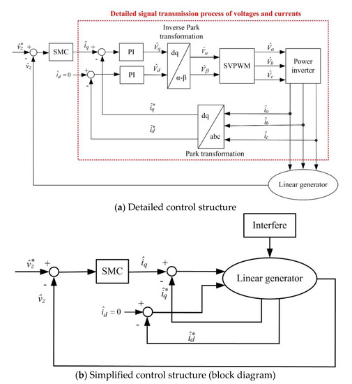 Figure 10a shows the detailed control structure of a double-buoy OWECS, including the ocean wave’s vertical direction speed , outer buoy’s vertical direction speed , sliding mode control method (SMC), proportional integral (PI) control method, linear generator, Park transformation, power inverter, and space vector pulse width modulation (SVPWM). If the detailed signal transmission process of the voltages and currents in Figure 10a is ignored, the simplified control structure of a double-buoy OWECS is shown in Figure 10b. In Figure 10b, an interference term is added to test the anti-interference ability of the sliding mode control method.