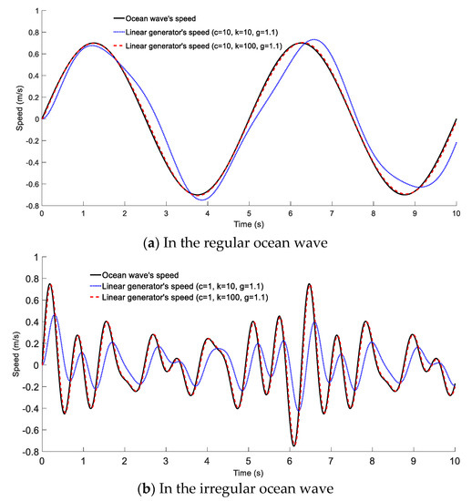 Assuming that the moment of inertia of the linear generator is and the interference term is , the simulation optimization control result of the double-buoy OWECS according to the sliding mode control method is shown in Figure 11. Figure 11a is the simulation control result with a regular ocean wave, while Figure 11b is that with an irregular ocean wave. Figure 11 indicates that the vertical direction motion phase between ocean wave and linear generator (also is the outer buoy) can be synchronized using the appropriate parameter settings of the sliding mode control method; thus, the operational efficiency of a double-buoy OWECS can be improved.