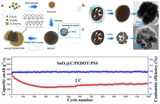 - Li, H.; Zhang, B.; Ou, X.; Zhou, Q.; Wang, C.; Peng, C.; Zhang, J. Core-Shell Structure of SnO2@C/PEDOT: PSS Microspheres with Dual Protection Layers for Enhanced Lithium Storage Performance. ChemElectroChem 2019, 6, 2182–2188. [Google Scholar] [CrossRef]