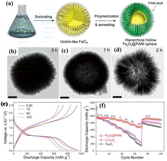 - Jeong, J.-M.; Choi, B.G.; Lee, S.C.; Lee, K.G.; Chang, S.-J.; Han, Y.-K.; Lee, Y.B.; Lee, H.U.; Kwon, S.; Lee, G. Hierarchical hollow spheres of Fe2O3@ polyaniline for lithium ion battery anodes. Adv. Mater. 2013, 25, 6250–6255. [Google Scholar] [CrossRef]