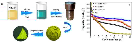 - Zhou, Y.; Li, Y.; Yang, J.; Tian, J.; Xu, H.; Yang, J.; Fan, W. Conductive Polymer-Coated VS4 Submicrospheres As Advanced Electrode Materials in Lithium-Ion Batteries. ACS Appl. Mater. Interfaces 2016, 8, 18797–18805. [Google Scholar] [CrossRef]
