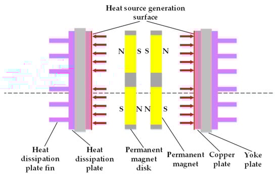 In this paper, the heat dissipation structure of a double disk magnetic coupler is taken as the research object. Figure 2 shows a simplified model of the heat dissipation structure of a double disk magnetic coupler, including a heat source, copper plate, conductor yoke and heat dissipation plate. The end face of the copper plate close to the permanent magnet plate is simplified as a heat source-generating surface, and the heat flow boundary is indicated by an arrow. The conductor yoke is connected to the fins, so that the heat generated on the copper plate can be uniformly and sequentially transmitted to the yoke plate, the heat dissipation plate and the fins of the heat dissipation plate. In this paper, the gas heat transfer control equation is calculated by the steady-state solution [17]. The heat generated by the eddy current loss is transferred from the surface of the copper plate to the surface of the fins of the heat dissipation plate, and finally, the heat is transferred away by the heat exchange between the fin surface and the environment, so as to avoid the accumulation of a large amount of heat on the surface of the copper plate. In addition, all the joints are filled with thermal grease to reduce the contact thermal resistance between components.