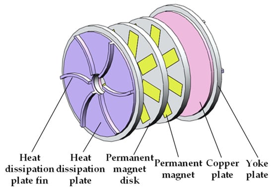 Double disk magnetic couplers, a revolutionary energy-saving transmission device, boast the advantages of high efficiency speed regulation, strong adaptability and low running costs. They have become one of the key research objects of magnetic transmission systems in recent years [1,2]. During the operation of the coupler, the magnetic induction eddy current loss will generate a significant amount of heat, leading to an increase in the temperature of all parts of the transmission system. Too high a temperature will affect the working characteristics of permanent magnet materials [3,4], which in turn affects the reliability of the transmission system. Electromagnetic temperature–stress coupling energy is a rather complicated problem, which has become one of the hot topics in the field of magnetic coupling [5].