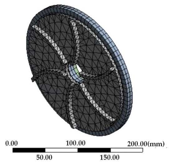 Based on the three-dimensional model of the heat dissipation structure of the double disk magnetic coupler, a steady-state thermal simulation is carried out. The solid domain part and the fluid domain part [18] of the heat dissipation disk are established using a bidirectional coupling solution, in which the solid domain adopts the finite element method and the fluid domain adopts the finite volume method. The rotation domain is selected as the fluid domain, with the speed assigned to 400 r/min, and the grid is set as the MRF model. The meshing is shown in the following Figure 4.