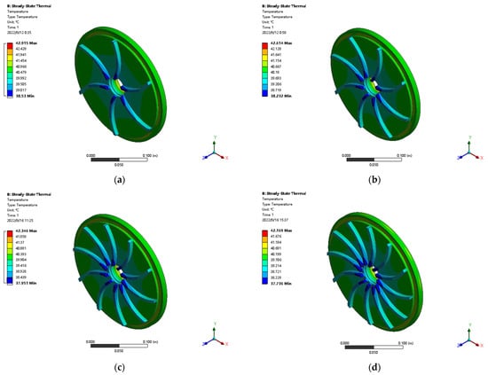Simulation diagram of steady-state temperature field of left heat dissipation plate of double disk magnetic coupler. (a) The number of fins of the heat dissipation plate is 6; (b) the number of fins of the heat dissipation plate is 8; (c) the number of fins of the heat dissipation plate is 10; (d) the number of fins of the heat dissipation plate is 12.