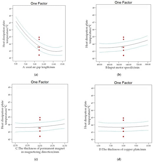 The F-value of the variance analysis of the orthogonal experimental results can be used as a parameter to respond to significant differences. The larger the F-value of the variance analysis, the higher the significant influence [20]. For the six factors, the axial air gap length is 219.53, the input motor speed is 14.29, the thickness of the permanent magnet in the magnetizing direction is 2.95, the thickness of the copper plate is 0.23, the number of fins of the heat dissipation plate is 2.27 and the length of the fins of the heat dissipation plate is 4.55. Therefore, the order of significant influence from high to low is A > B > F > C > E > D. It can be observed that the axial air gap length is the most significant factor affecting the heat dissipation performance, followed by the input motor speed, and its value should be reasonably selected.