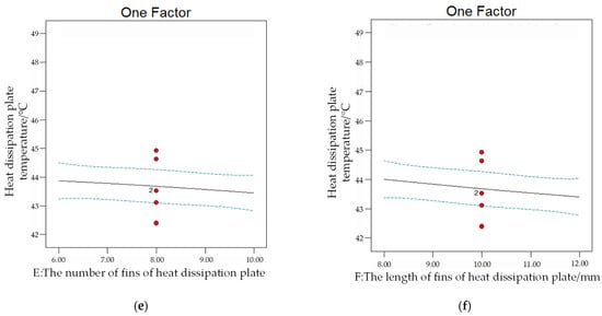 Figure 7c shows the change in the temperature response surface of the heat dissipation plate at the response point with the influence factors B and E, when the influence factors are as follows: A = 10 mm, C = 14.70 mm, D = 8.00 mm and F = 10.00 mm. It can be observed that the smaller the value of B, the smaller the value of E and the lower the temperature of the heat dissipation plate, and the influence of BE on the objective function is directly proportional. When B = 400 r/min and E = 6, the temperature of the heat dissipation plate reaches its lowest value, about 43.0 °C. That is, with the decrease in the input motor speed, the number of fins of the heat dissipation plate decreases, and the temperature of the heat dissipation plate gradually decreases.