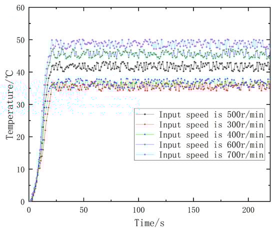 It can be observed from Figure 10 that when the double disk magnetic coupler starts up, the temperature of the heat dissipation plate gradually rises, and it reaches a stable running state after 30 s. The five curves in the figure show that the temperature of the heat dissipation plate increases with the increase in the input motor speed. By comparing the simulation results in Table 7 with the physical test results, it can be observed that the simulation results are in good agreement with the physical test results, and the maximum error is 4.8%. The optimal parameter combination obtained after the correction of No.3 in Table 7 is selected, and the error between the simulation result and the physical test result is 1.9%, which indicates that the optimized parameters meet the expected effect of the actual transmission, and can be used to guide the design of the heat dissipation structure of the double disk magnetic coupler in the permanent magnet eddy current drive system of a coal mine.