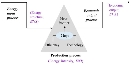 Compared with Equation (3), the ENI is further decomposed into four new factors in Equation (4), i.e., the potential energy intensity (PEI), the production technology gap between group and meta-frontier (TEG), the group energy efficiency (GEF), and the group technology (GTC). Figure 1 clearly illustrates the decomposition process.